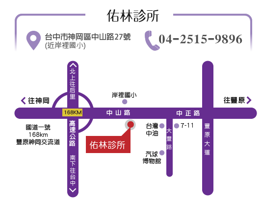 中山高速公路>豐原站第一站(岸裡國小站)下車>(對面)佑林診所